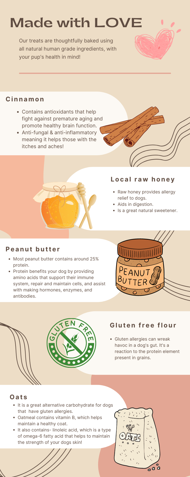 Our treats are thoughtfully baked with some of the tastiest and freshest locally sourced ingredients ensuring a delicious treat every time. When purchasing our treats not only are you supporting our small business but you're supporting other locally owned business in Georgia too!