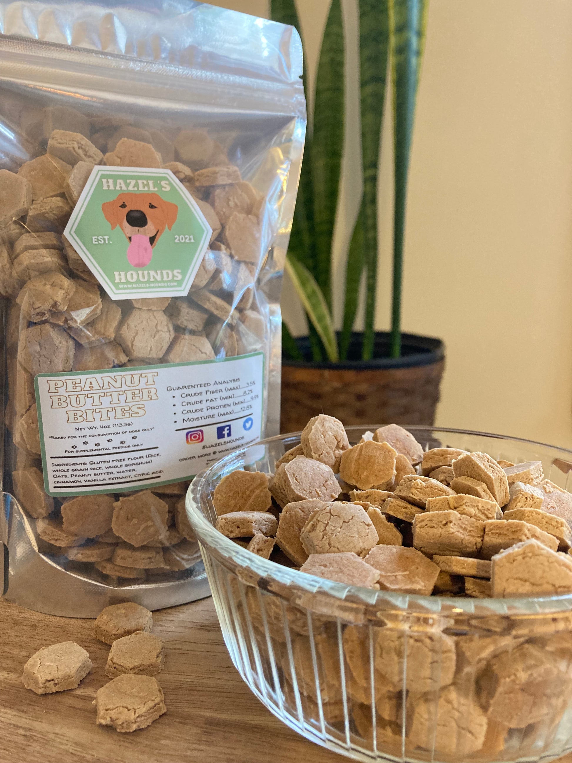 From learning tricks, crate training, or just because! Our bite sized gluten free peanut butter baked bites still pack all the flavor and crunch as our regular sized bites but with half the size.