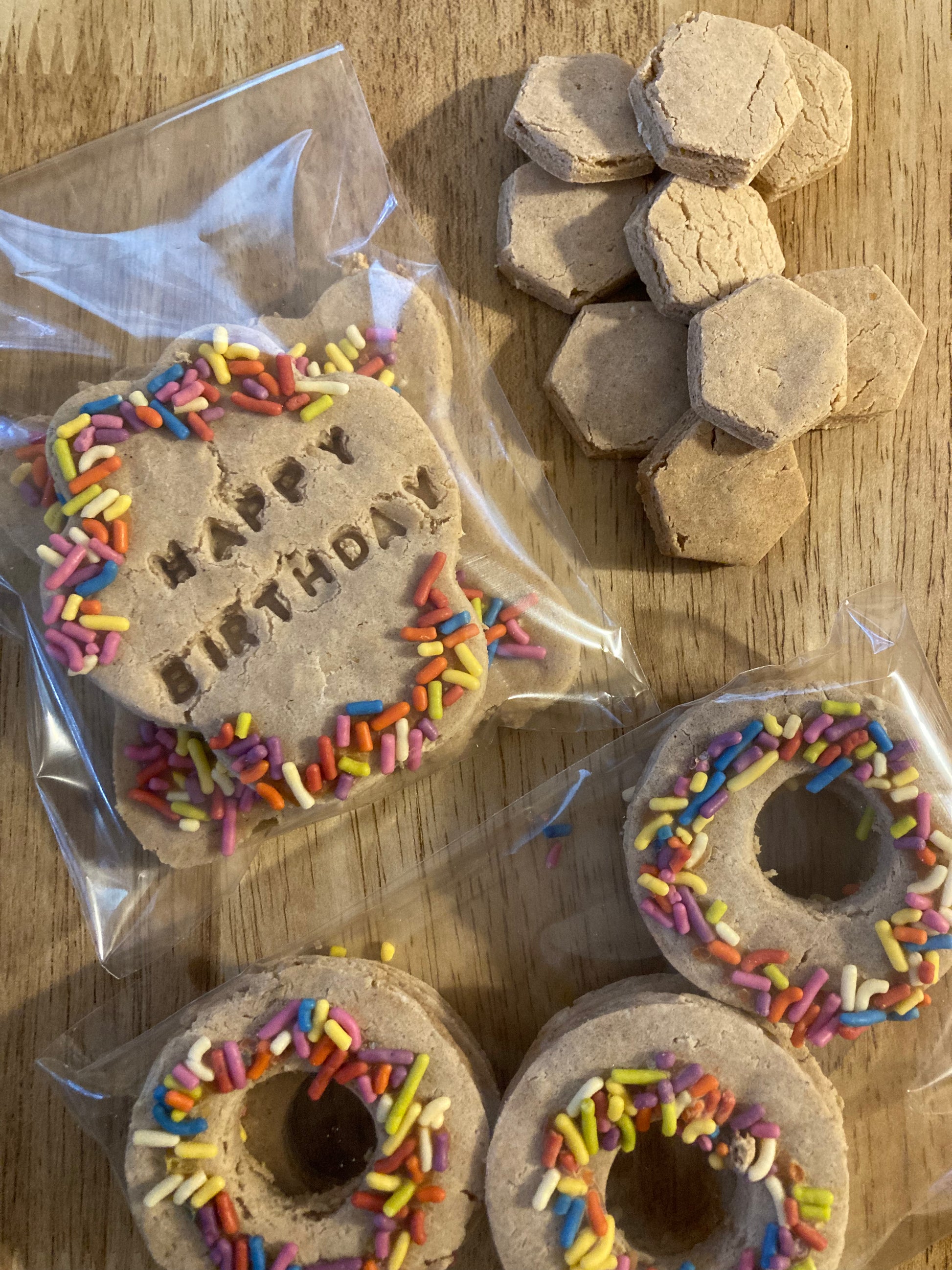 1 bag of 3 iced cookies with sprinkles, one Happy Birthday paw and two bones